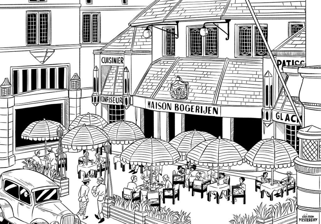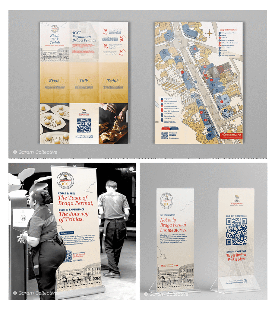 Illustration assets of Jalan Braga. These illustrations were implemented on several graphic collaterals of Braga Permai’s 100th anniversary in November 2023—final designs and collaterals courtesy of Garam Collective, Jakarta.